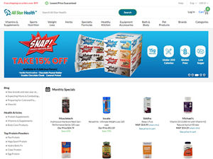 Welcome to the All Star Health affiliate program. Earn a 10% commission with a possibility to increase to 14% as your sales increase. When someone enters AllStarHealth.com through a link on your website, you get credit for purchases made up to 30 days later. We provide you with a selection of text links, images and banners that you can place on your web site. All Star Health is a leading online retailer of nutritional supplements, vitamins, workout aids, healthy living products and much more. Our low-price guarantee ensures our customers the best deal available and allows them to shop our 25,000+ plus product line with confidence. We offer super fast shipping to anywhere in the United States and are available to answer your questions and help you find the best health and sports training products.