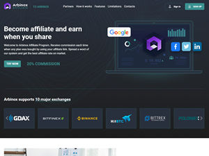 Welcome to Arbinox affiliate program. You will earn 20% COMMISSION of each plan LIFETIME for each referred client. Once you refer a client he became your referral forever. Apply today, spread a word of our system and get the best affiliate rate on market. About Arbinox.com: Arbinox is the #1 Crypto Arbitrage Trading Platform. Professional trading system for scanning, analyzing, developing strategies and trading by statistical arbitrage in cryptocurrency markets.