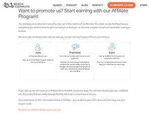 Welcome to the Beach Commute affiliate program. Your commission is 30% of every sale, the cookie window is 90 days, plus your audience gets a 10% discount when they use your coupon code. About BeachCommute.com: We're Beach Commute. We created the GoRemote Employment course, an online course to help people become a digital nomad so that they can travel the world. Inside of the course, you'll learn: - Which remote job is right for you (even if you have no idea where to begin) - Where to find the best remote jobs (80% of remote jobs never get posted publicly - we'll show you how to find these) - How to get an interview with your dream companies (no more applying without hearing back) How to ace your remote interviews and get the job offer - How to negotiate your remote-work permission to work from foreign countries (and not just remotely from your home city). If you have an audience that is interested in traveling, working remotely etc. then sign up for our Affiliate Program!