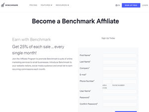 Join the Benchmark Affiliate Program to promote our suite of online marketing services to small businesses. Introduce Benchmark to your website visitors, social media audience and email list to earn recurring commissions each month. Whenever someone you refer orders an account from us, you receive 25% of the signup payment. You also continue to receive the commission for any recurring payments they make, month after month for up to 30 months.
