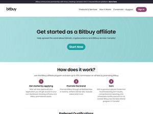 Join the Bitbuy affiliate program and earn up to 40% commission on all fees by promoting Bitbuy. Bitbuy is the leading Canadian digital currency trading platform. The company's mission is to provide convenient, dependable and secure access to Bitcoin and other digital currencies. Currently, Bitbuy offers deep liquidity across 10+ spot trading markets through its trading interfaces and OTC (Over-the-counter) trading desk.