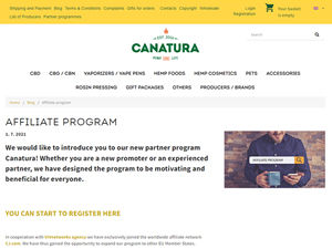 Welcome to Canatura Affiliate Program. Canatura is a store focusing on a healthy lifestyle, fitness, healthy nutrition, alternative medical products, cannabis products, vaporization, pet products, cannabis literature and other accessories. Affiliate Program Terms: • 10 % commission • 30 days cookie lifetime • SEM is not allowed. Emailing and custom creatives after approval. We operate our website in this languages: English, German, Czech, Slovak, Polish If you have any other queries please contact podpora+canatura@vivnetworks.com