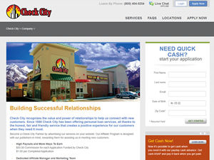 heck City has provided short term financial solutions to the under-banked since 1989. Check City creates loyal customers by ensuring they understand the terms, process and risks, along with the fast cash they are looking for. When your traffic applies at Check City they’re looking for a loan, they will not to be sold any 3rd party or receive a never ending barrage of offers. Check City Affiliate Program Pays: • $80.00 Commission for each Application Funded by Check City • $1.00 per Completed Application