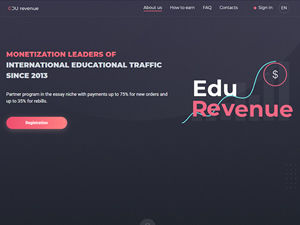 Edu-Revenue.com is an affiliate program in the essay niche (custom writing services). We work on the principle of RevShare: from the start, you get 60% of the price of a new order and 20% for rebills. You meet the KPI for the volume of orders – we increase your commission percentage, up to 75%! We provide custom writing services for students from the United States, Great Britain, Canada, Australia, and other English-speaking countries. A team of qualified native language writers provide our clients with high-quality academic works of any complexity.