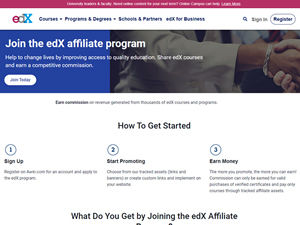 edX is the trusted platform for education and learning. Founded by Harvard and MIT, edX is home to more than 20 million learners, the majority of top-ranked universities in the world, and industry-leading companies. As a global nonprofit, edX is transforming traditional education, removing the barriers of cost, location and access. Join the edX affiliate program, share our online courses and earn a competitive commission. The more you promote, the more you can earn! Starting commission rates are 5% for voucher/coupon/discount sites and 10% for all other affiliates.