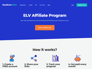 Join the EmailListVerify.com affiliate program and Earn 15% commission for every sale. Email List Verify is a leading email list verification tool that can be easily tailored to startups or complete corporate email marketing solutions. With Email List Verify, you'll discover an entirely new affiliate opportunity and an earning potential that exceeds most of the other Affiliate programs. Company Info: emaillistverify.com s.r.o Obchodná 2 811 06 Bratislava Slovakia, European Union