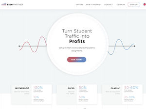 Welcome to the EssayPartner affiliate program. The services of writing academic papers have been provided by us since 2009. Therefore, we have more experience than enough, and in combination with the new partner account, landing pages and promo advantages are obvious. With a top-class service to back up the price, our average order is $148. And we even take care of the refunds. EssayPartner.com is a trusted affiliate program for your education traffic. Sign up now and turn your student traffic into cash easily!