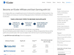 Become an fCoder Affiliate and start earning 20% from each sold copy of our products! Our company offers you a straightforward source of online profit via reselling our software products. You, as our affiliate, can increase your income by finding opportunities of distribution and selling our software to end-users. Why is the fCoder Affiliate Program profitable? • Easy to sign up and start • Get 20% from each sold copy (Print Conductor or FolderMill) • 100% safe payments (handled by PayPro Global, Inc.) • Order processing, fraud management and customer support is handled for you • Your revenue totally depends on the number of successful sales made • Monitor and analyse your referral sales in reports. • Receive scheduled payouts by any suitable method Company Info: fCoder SIA Address: Dzirnavu iela 57A, Centra rajons, Rīga, LV-1010, Latvia Phone: +371 25 723 233