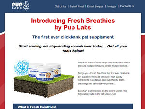 Join the Fresh Breathies affiliate program and earn up to 50% Commissions on the entire funnel - the biggest payouts in the pet space ever. About Fresh Breathies by Pup Labs: Fresh Breathies - the first ever clickbank pet supplement made with safe, high-quality ingredients in an NASC-approved facility. Fresh Breathies is an all natural dental dog chew that helps eliminate bad doggy breath by getting to the root cause - digestive dysfunction. By rebalancing your dog’s gut microbiome, Fresh Breathies protects their health from the devastating effects of digestive dysfunction while also eliminating their bad breath without brushing their teeth or adding chemicals to their water.