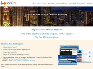 Hopato is a travel meta search that uses a unique search engine algorithm that allows you to compare millions of flights, hotels and attractions from international companies to find the cheapest and most convenient deal for you. • *Earn 40% revenue on every sale • *30 days cookie tracking • *Special bonus for Top performing affiliates • *Affiliate Sign up process is free and easy! • *Dedicated Affiliate Manager • *Back office
