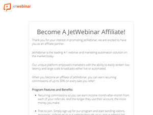 OtherThank you for your interest in becoming a JetWebinar affiliate. JetWebinar is the leading 4-1 webinar and marketing automation solution on the market today.