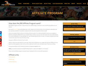 Welcome to JPW Racing Tipster Affiliate Program. Join our affiliate program and build affiliate links to JPW, make your first sale and earn 31% of whichever subscription fee your sale has purchased. This will then continue for life every time that person renews at JPW. JPW Racing Tipster is a well established tipping service. We have been in the game since 2008 and have a big reputation within the industry. We are respected by many and have a big following.