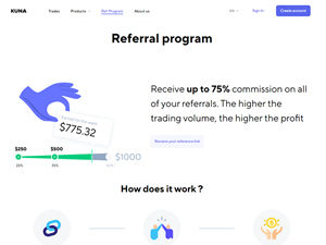 Otherthe Kuna Exchange referral program. Become our partner and earn up to 75% commission on all your referalls.