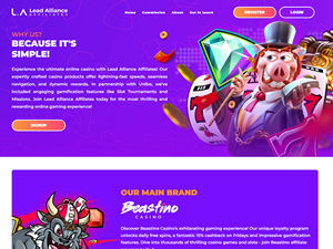 Welcome to Lead Alliance Affiliates, the official affiliate program for Beastino.com. You'll start off with a minimum of 25%, but as your referred players make deposits, your rate will increase even higher! And the best part? You won't have to worry about any negative carryover for the next month - it's a fresh start every time. Join Lead Alliance Affiliates today for the most thrilling and rewarding online gaming experience! Brand License Info: Beastino.com casino is Licensed under Mountberg B.V, a company based at Kaya W.F.G. (Jombi) Mensing 24 Unit A, Curacao, under gaming License number 8048/JAZ issued by Antillephone Services N.V., authorised and regulated by the Government of Curacao.