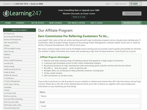 Learning247.co.uk offers state-of-the-art online-learning and self-study multimedia programs across virtually every training area: IT Certification, Web & Graphic Design, Business & Accounting, Project Management, CAD, Lifestyle, Health, Social care, Personal Development, Languages, CPD & much more... Our Affiliate Program Advantages: • 20% commission on all direct sales. • 60 day cookie window • Massive and wide-reaching range of training products that appeal to a huge range of customers. • Customers get immediate access to 24x7 online multimedia modules. • No physical products to ship; meaning fast order-processing, great customer-service and very low returns. • We offer a ‘beat any quote’ policy to get the sale. • Multiple offers run continually to keep potential customers coming back.