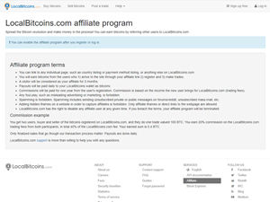 Welcome to the LocalBitcoins.com Affiliate Program. LocalBitcoins.com is a person-to-person bitcoin trading site. Our Affiliate program Terms: • You can link to any individual page, such as country listing or payment method listing, or anything else on LocalBitcoins.com. • You will earn bitcoins from the users who 1) arrive to the site through your affiliate link 2) register and 3) make trades. • A visitor will be considered as your affiliate for 3 months. • Payouts will be paid daily to your LocalBitcoins wallet as bitcoins • Commissions will be paid for one year from the user's registration. Commission is based on the income the new user brings for LocalBitcoins.com (trading fees). • Any foul play, such as misleading advertising or marketing, is forbidden. • Spamming is forbidden. Spamming includes sending unsubscribed private or public messages on forums/reddit, unsubscribed mass-mail, etc. • Adding hidden iframes on a website in order to capture affiliates is forbidden. Only affiliate iframes or direct links to the webpage are allowed. • LocalBitcoins.com has the right to disable any affiliate user at any given time. If you breach the terms, your affiliate program will be terminated. Commission example You get two users, buyer and seller of the bitcoins registered on LocalBitcoins.com, and they do one trade valued 100 BTC. You earn 20% commission on the LocalBitcoins.com trading fees from both participants, in total 40% of the LocalBitcoins.com fee. Your earned sum is 0.4 BTC.