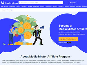 Welcome to the Media Mister Affiliate Program. You will earn 50% commission as a Media Mister Affiliate on each sale from your referred customer. About MediaMister.com: Media Mister - The Best Social Media Marketing Service Provider! We offer a wide range of promotional services to boost your presence on all social media platforms.