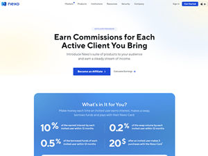 Join the Nexo affiliate program and earn 10% of the earned interest by each invited user within 12 months, 0.2% of the swap volume by each invited user within 12 months, 0.5% of the borrowed funds of each invited user within 12 months & $20 after an invited user makes 3 purchases with the Nexo Card. About Nexo.io: Nexo is the world's leading regulated institution for digital assets. The company’s mission is to maximize the value and utility of cryptocurrencies by offering tax-efficient Instant Crypto Credit Lines, a high-yield Earn Crypto Interest product, Send & Pay capabilities, and sophisticated trading & OTC services, all while providing the top-tier custodial insurance and military-grade security of the Nexo Wallet. Nexo manages assets for over 4М+ users across 200+ jurisdictions and has processed over $80 billion since its launch in 2018.