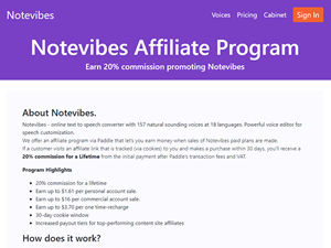 Notevibes offers an affiliate program via Paddle that let’s you earn money when sales of Notevibes paid plans are made. If a customer visits an affiliate link that is tracked (via cookies) to you and makes a purchase within 30 days, you’ll receive a 20% commission for a Lifetime from the initial payment after Paddle’s transaction fees and VAT. Our Affiliate Program Highlights: • 20% commission for a lifetime • Earn up to $1.61 per personal account sale. • Earn up to $16 per commercial account sale. • Earn up to $3.70 per one time-recharge • 30-day cookie window • Increased payout tiers for top-performing content site affiliates About Notevibes.com: Notevibes is an online text to speech converter with 157 natural sounding voices at 18 languages. Powerful voice editor for speech customization.