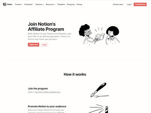 Join Notion's Affiliate Program and earn 50% of all payments for the first 12 months — with no limits. About Notion: Notion is the all-in-one workspace that combines docs, wikis, and project management. Tens of thousands of teams around the world use it to collaborate, stay informed, and get more done together.