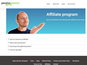 Join the Passive Income Geek Affiliate Program and earn a 25% commission ($99 per sale). About Passiveincomegeek.com: Passive Income Geek (created by Morten Storgaard) is a beginner-friendly course teaching how to build websites that can help you earn passive income. The Passive Income course is a mix of text, tools, and easy-to-follow videos to help you along the way.