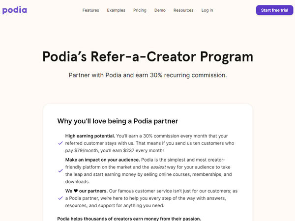Podia is the simplest and most creator-friendly platform on the market and the easiest way for your audience to take the leap and start earning money by selling online courses, memberships, and downloads. You shouldn’t need to pay for separate platforms for them. Podia replaces 5+ tools for the price of one. Join the Podia affiliate program and earn 30% recurring commission.