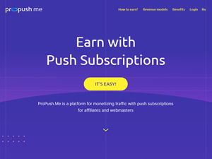 ProPush.me is a platform allowing you to monetize your traffic with Push Notifications. Enjoy a wide selection of revenue models (CPS, Revshare), easy to set up settings and comprehensive statistics. Easy flow, full stats, and fast payouts. Sign up now!