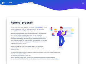 Welcome to RevenueBot’s Referral Program. You will earn 30% of the amount of commission that the user pays for using the RevenueBot. Our referral program is recommended for anyone interested in crypto currencies and trading, webmasters, arbitrators, site owners, forums, blogs, social groups, networks and so on. About RevenueBot.io: RevenueBot - automated bot trading on top cryptocurrency exchanges. With RevenueBOT you can make money on your favorite exchanges automatically. The crypto bot will automatically buy and sell Bitcoin, Ethereum, Litecoin and other cryptocurrencies on Binance, Bitfinex, Bittrex, Poloniex, FTX, Cex.io, HitBTC, OKX, Kraken, Kucoin, Huobi and many more. Our crypto trading bot is free. We just take a commission of 20% on the profit that you make when using the crypto bot, but not more than 50 USD in BTC equivalent per calendar month!