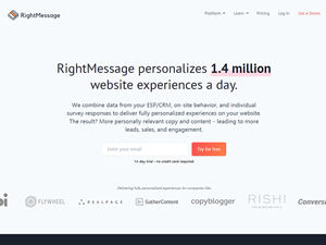 RightMessage is a website personalization software. It works alongside the tools you're already using to dramatically increase conversions by personalizing what your visitors, subscribers, and customers are seeing. We combine data from your ESP/CRM, on-site behavior, and individual survey responses to deliver fully personalized experiences on your website. The result? More personally relevant copy and content – leading to more leads, sales, and engagement. Join the RightMessage affiliate program and earn 20% Recurring Commission for each referred customer!