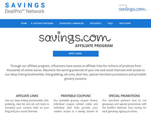 Savings.com is a leading coupon and deal site. We offer thousands of deals from hundreds of online merchants, as well as exclusive deals with our partner merchants. Through the Savings.com DealPro Network affiliate program, influencers have access to affiliate links for millions of products from thousands of online stores. Maximize the earning potential of your site and social channels with access to our deep linking bookmarklet, link-grabbing, ad units, deal lists, special merchant promotions and printable grocery coupons.