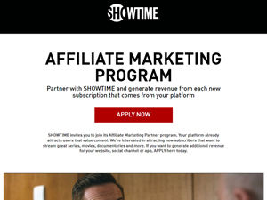 Welcome to the SHOWTIME affiliate program. Your platform already attracts users that value content. We're interested in attracting new subscribers that want to stream great series, movies, documentaries and more. If you want to generate additional revenue for your website, social channel or app, join us today. SHOWTIME is a commercial-free, award-winning streaming service featuring original series, can’t-miss movies, groundbreaking documentaries, laugh-out-loud comedy specials, hard-hitting sports and much more. Watch live TV or stream on-demand on tablet, phone, TV or computer. With SHOWTIME, subscribers can also download full episodes and movies to their favorite mobile devices and watch offline, whenever and wherever. No cable subscription is required and users can cancel anytime. Customers can sign up for SHOWTIME directly at SHOWTIME.com for just $10.99 a month.