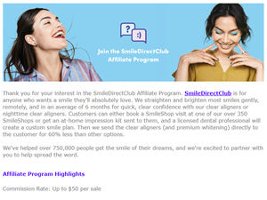 Welcome to the SmileDirectClub Affiliate Program. SmileDirectClub is for anyone who wants a smile they’ll absolutely love. We straighten and brighten most smiles gently, remotely, and in an average of 6 months for quick, clear confidence with our clear aligners or nighttime clear aligners. We believe a smile you'll love shouldn't cost a fortune. That's why we offer two convenient ways to pay 60% less than other brands. SmileDirectClub Affiliate Program Highlight: Commission Rate: Up to $50 per sale Tracking Cookie Length: 30 days