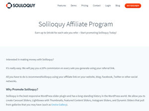 Welcome to the Soliloquy affiliate program. We will pay you a 20% commission on every sale you generate using your referral link. All you have to do is recommend Soliloquy using your affiliate link on your website, blog, Facebook, Twitter or other social networks. Why Promote Soliloquy? Soliloquy is the best responsive WordPress slider plugin and has a long-standing history in the WordPress world. We allow you to create Carousel Sliders, Lightboxes with Thumbnails, Featured Content Sliders, Instagram Sliders, and Dynamic Sliders that pull from galleries that you may have (such as Envira Gallery). Soliloquy is fast and offers the best support in the market. In short, this is the best WordPress plugin for a fast, responsive slider. Last but not least, you earn 20% of every sale which can be as much as about $50 per sale. Below is the commission structure: Single License sells for $19 – you earn $3.80 Multi License sells for $49 – you earn $9.80 Developer License sells for $99 – you earn $19.80 Master License sells for $249 – you earn $49.80 Affiliates are our partners, and we want them to make money. Our affiliates are earning thousands per month. Ready to make money with Soliloquy? First thing you need to do is join our affiliate program on ShareASale.