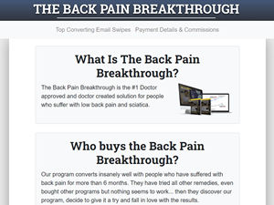 Join The Back Pain Breakthrough affiliate program and earn up to 90% commission. This #1 back pain offer has high conversion rates, high commissions and high epcs. Promote today and begin collecting massive payouts right away. The Back Pain Breakthrough is the #1 Doctor approved and doctor created solution for people who suffer with low back pain and sciatica.