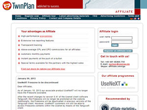 TwinPlan is an Affiliate Program provided by Omniga GmbH & Co. KG for the products UseNeXT and Save.TV. Your advantages as an Affiliate of TwinPlan by Omniga: - High-performance programmes - Extensive live reporting features - Transparent tracking - Above-average CPL and CPO commissions for all affiliates - Automatic monthly payments - Instant payments at the push of a button - Special terms available for the partners with the highest sales