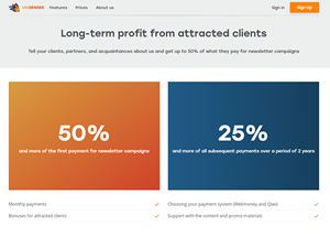 Otherthe UniSender affiliate program and start earning 50% and more of the first payment for newsletter campaigns, 25% and more of all subsequent payments over a period of 2 years. UniSender is a number...