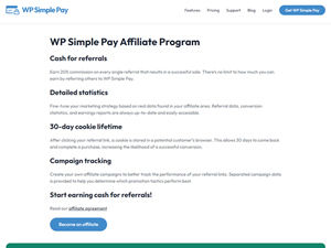 Welcome to WP Simple Pay's affiliate program. As an affiliate, you can earn 20% commission on every single referral that results in a successful sale. There’s no limit to how much you can earn by referring others to WP Simple Pay. About WP Simple Pay: WP Simple Pay is the #1 Stripe Payments Plugin for WordPress. Start accepting one-time and recurring payments on your WordPress site without setting up a shopping cart. No code required.