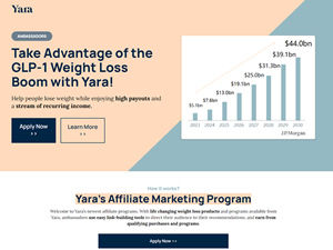 Welcome to Yara’s newest affiliate programs. With life changing weight loss products and programs available from Yara, ambassadors use easy link-building tools to direct their audience to their recommendations, and earn from qualifying purchases and programs. Industry-Leading Payouts: Maximize your earnings with some of the highest payouts available. Our generous commissions ensure your campaigns not only succeed but scale effortlessly. (https://joinyara.com/info/affiliateterms) Recurring Commissions: Enjoy a stable income stream with recurring commissions. Every time a customer renews with Yara, you get paid, creating a reliable source of long-term revenue. High Conversion Rates: Capitalize on our competitive edge with industry-low pricing, intuitive sales funnels, money back guarantee and high-converting pages. Our strategic approach ensures potential customers are guided smoothly through the buying process, maximizing your sales and profitability. Unlimited Scale, No Caps: With our extensive network of doctors and pharmacies, there are no limits to how much you can grow. We can handle unlimited daily appointments and high monthly volumes, providing infinite scalability. Expanding Product Line: Weight loss is just the beginning. We're expanding our offerings to include a full suite of medical health programs, giving you more opportunities to increase the lifetime value of every lead. Booming Industry Growth: Join a rapidly growing market. The medical weight loss industry is set to skyrocket from $5.1 billion this year to $44 billion by 2030. Now is the perfect time to partner with Yara and ride the wave of growth. Expertise in Internet Marketing: Our background in affiliate marketing gives us a deep understanding of our partners' needs. This insight helps us improve conversions and continually refine our site, creative content, and technology. By listening to our partners, we work together to boost joint profitability.