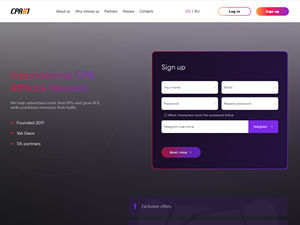 Powered by Affise, In-house tracking technology, CPA#1 provides accurate and real-time reporting for affiliates to monitor their performance and optimize their campaigns effectively.