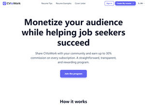 CVtoWork Affiliate Program is a leading General affiliate network offering RevShare commission rates.